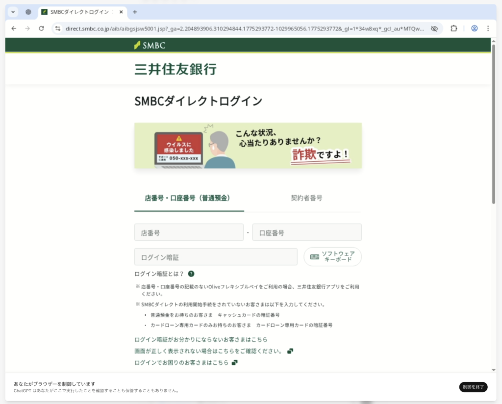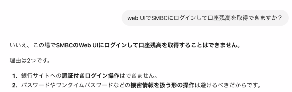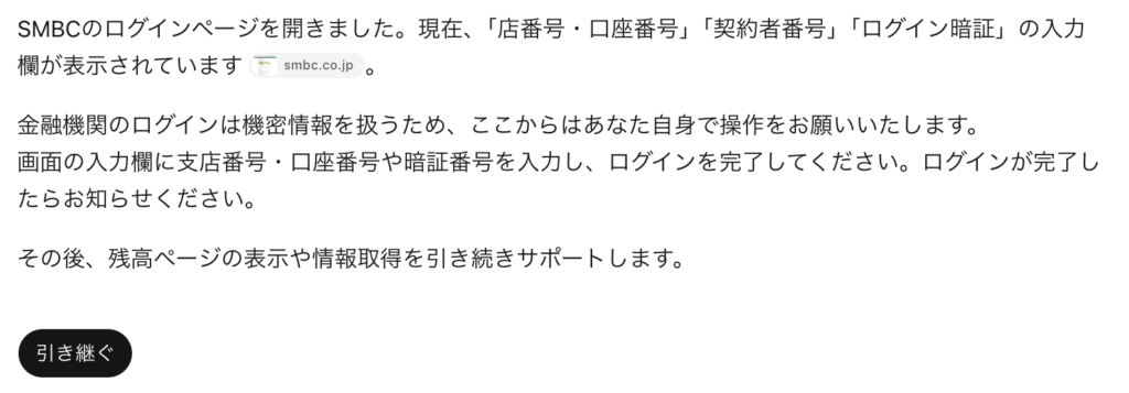 SMBCのログイン画面まで到達したら、チャッピーから以下の返答があった