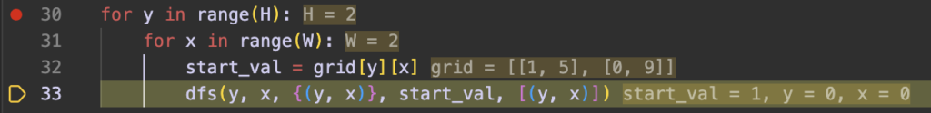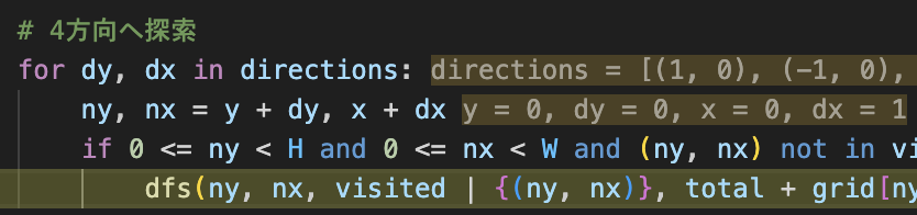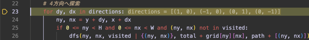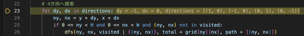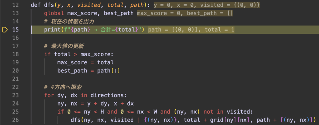 引数には、グリッドの座標y、x、すでに訪れた座標を記録するvisited、合計スコアを計算した結果を格納するtotal、経路を格納するpathが渡される。