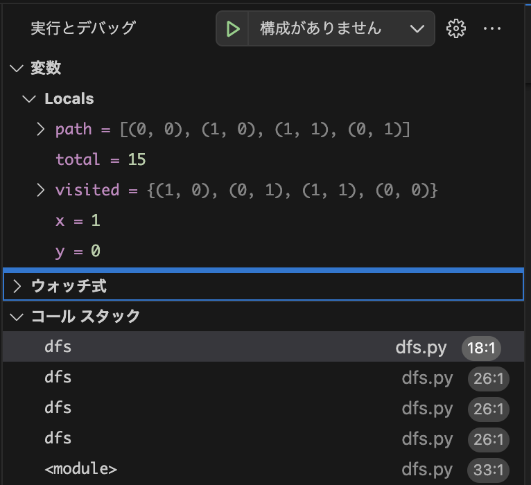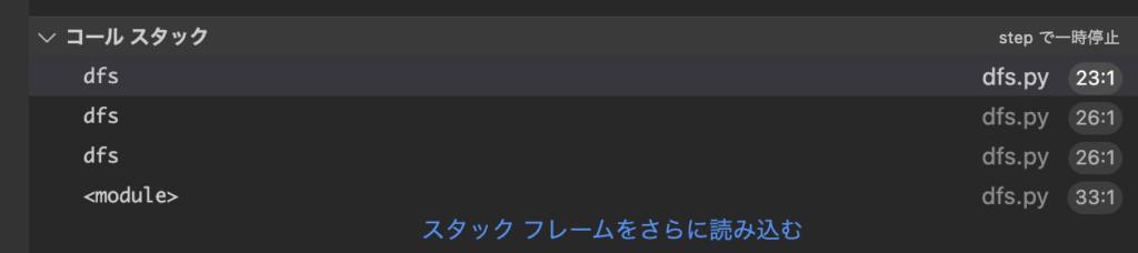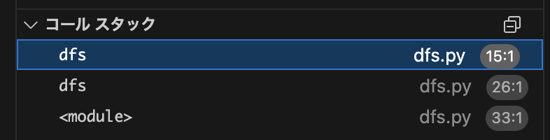 dfs関数の中でdfs関数が呼ばれた時、以下のように新しいスタックが追加される。