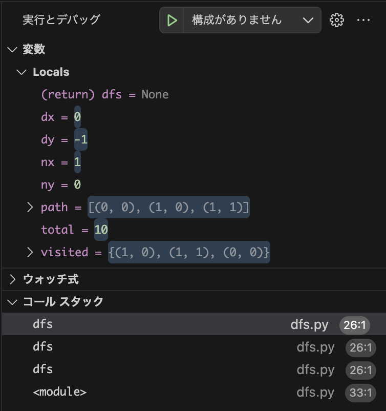 ここは理解しにくいが、以下の部分で4方向のどれも行けずに、再帰処理が終了していることが分かった。