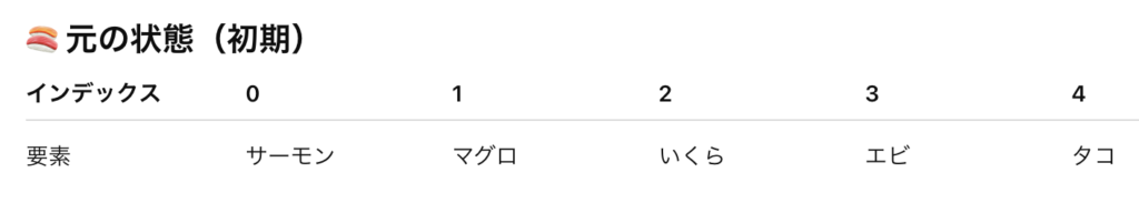 print(f'元の回転寿司リスト:' + '\n' + str(conveyor_belt_sushi))