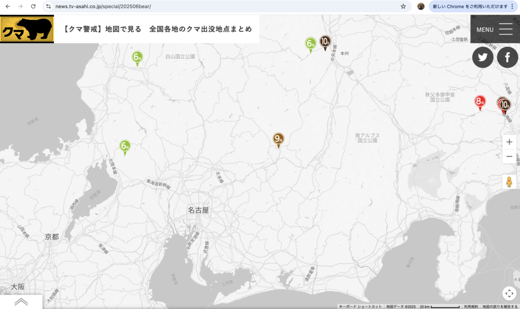 愛知県の出没情報は上記のマップ上では確認できなかった