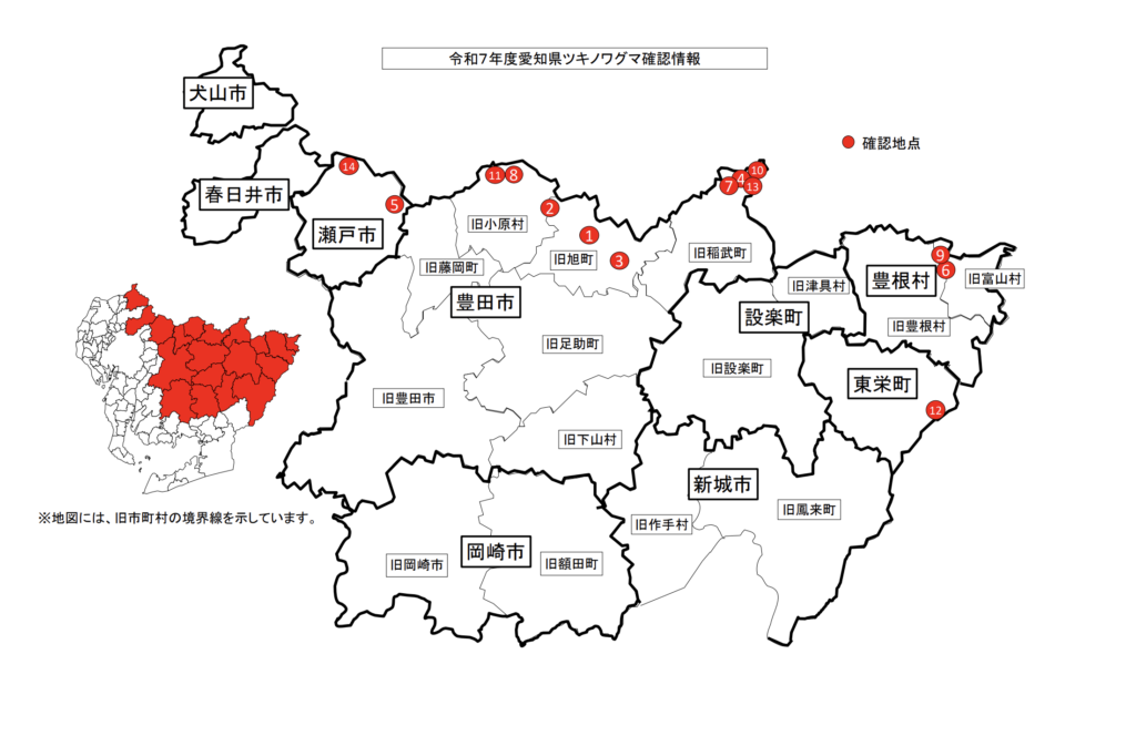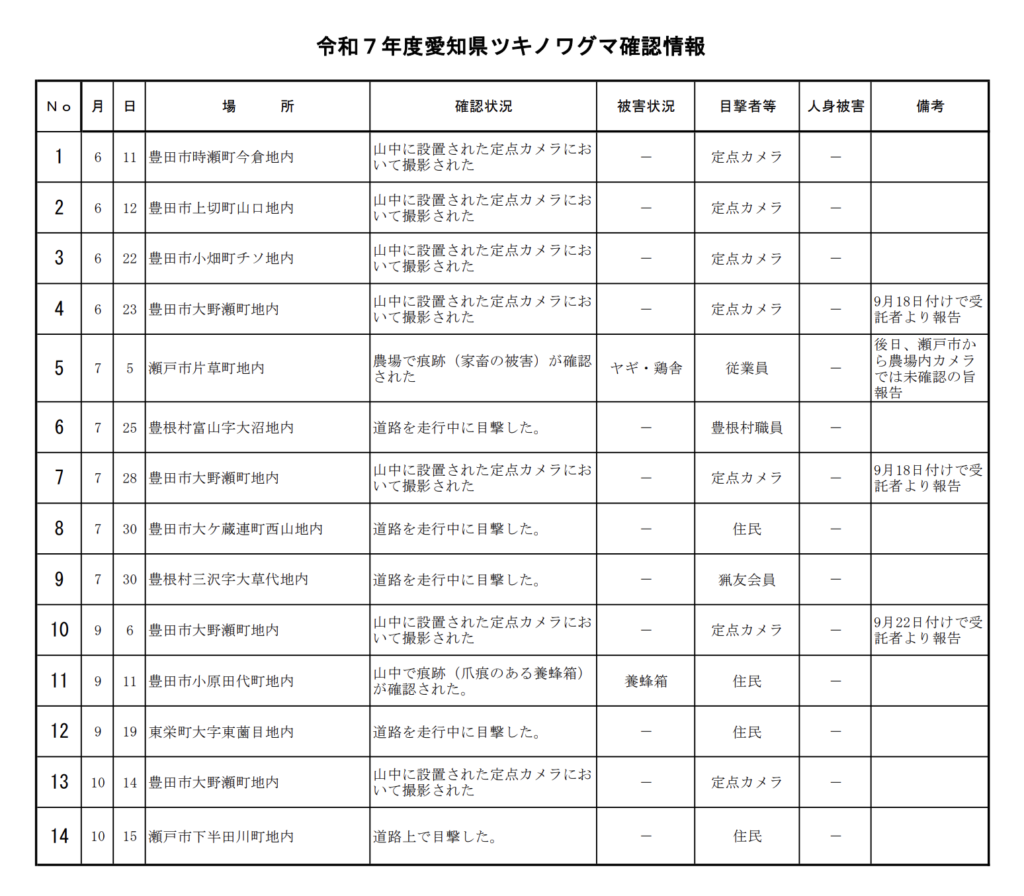 愛知県が公式に出している情報で14件のクマ目撃情報があった