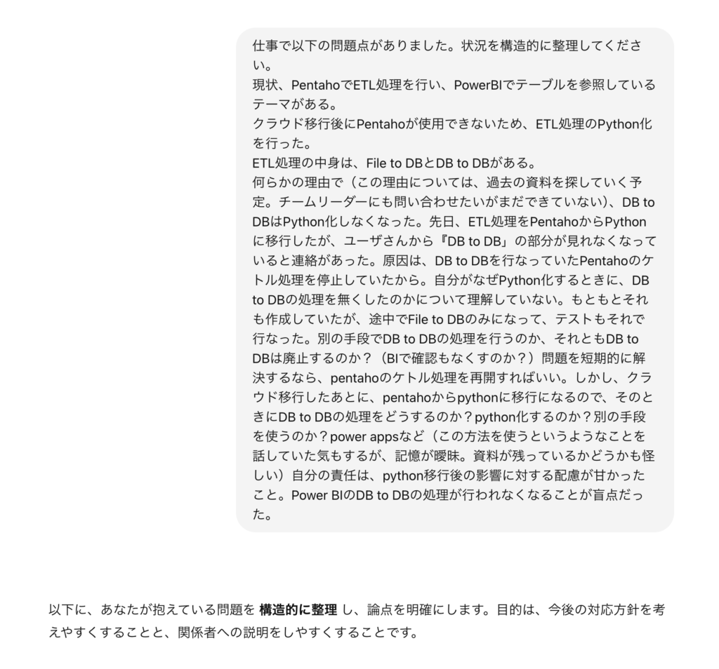その後の対応としては、Pentahoのジョブファイルで、DB to DBの処理のみが行われるようにして、Pentahoでは、DB to DBの処理を行い、Pythonでは、File to DBの処理を行うというようにしていくことになった。DB to DBの処理は、Python以外のPowerAppsなどのクラウド移行手段を上の人が考えていく。