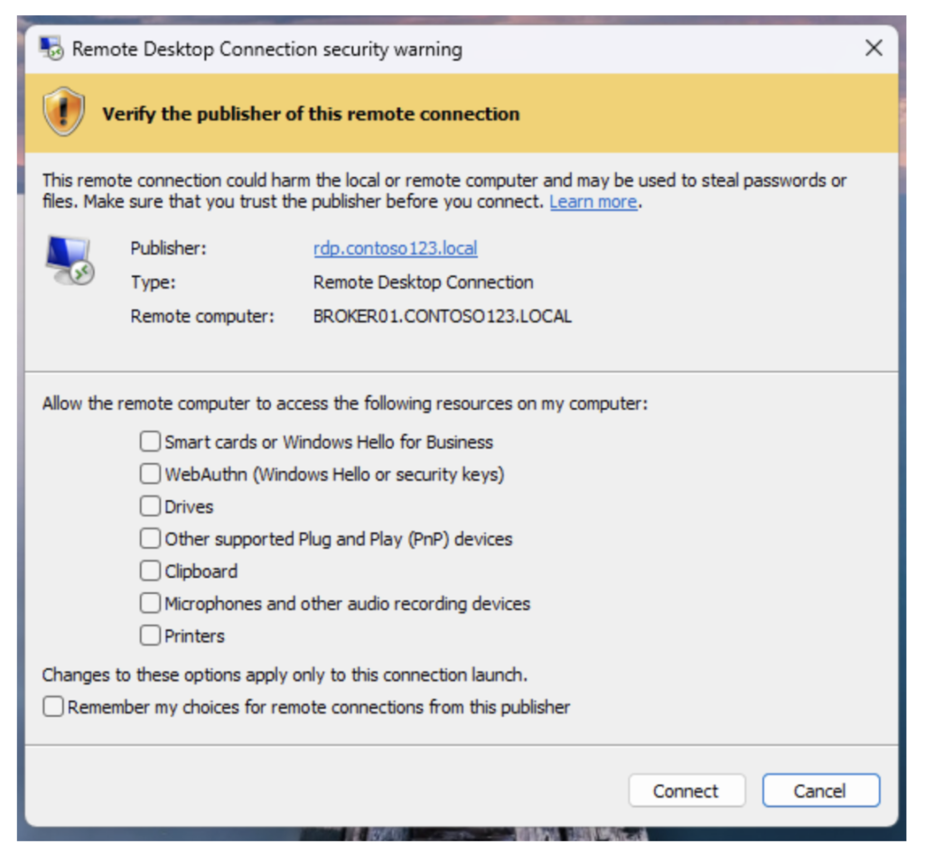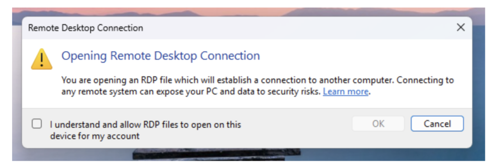 最初に表示される「I understand and allow RDP files to open…」というダイアログは、RDPファイルを開くこと自体にリスクがあることをユーザーに理解させるための教育的な警告です。これは、悪意のあるRDPファイルの実行を防ぐ目的があります。
