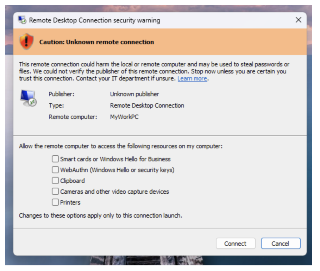 RDPファイルの発行元を検証できない場合、以下のセキュリティダイアログが開く