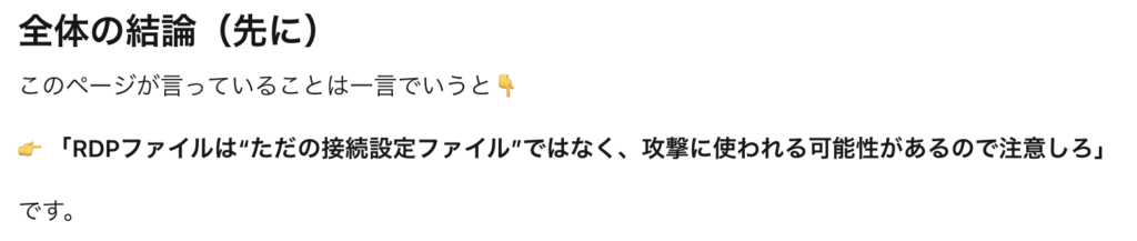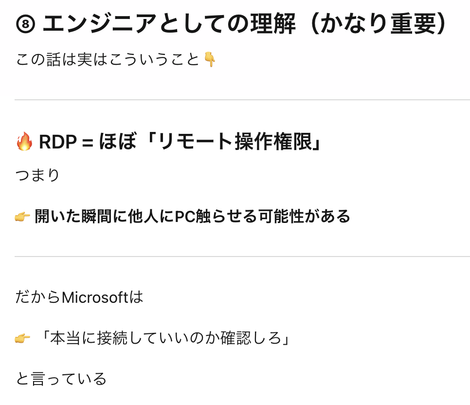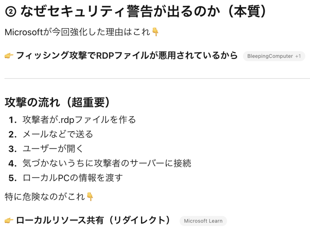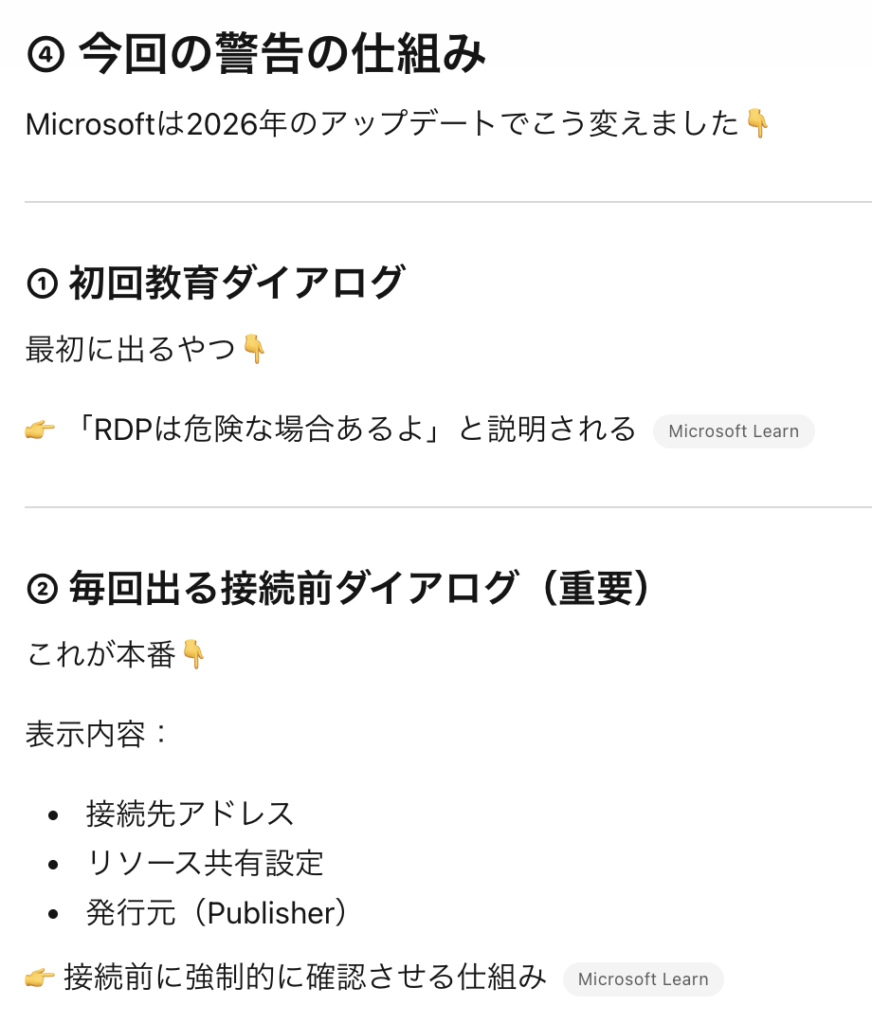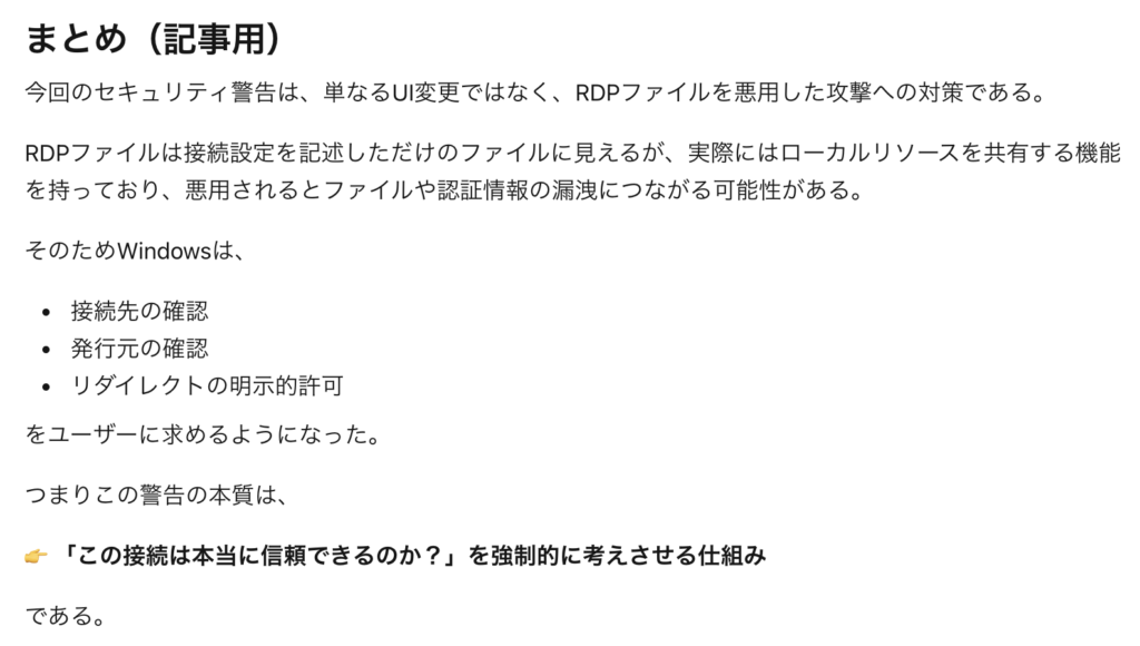 まとめると、RDPファイル経由の接続で警告が表示されるのは、外部ファイル由来のリスクと接続先の信頼性を確認するためであり、フィッシングなどのセキュリティリスクを防ぐための重要な仕組みです。