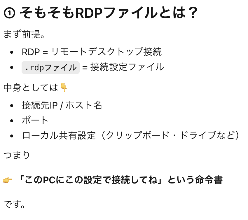 RDPファイル(.rdp)からリモートデスクトップ接続を行う際に警告メッセージが表示されるのは、セキュリティ上の理由によるものです。RDPファイルは外部から取得・配布される可能性があるため、Windowsはその安全性をユーザーに確認します。