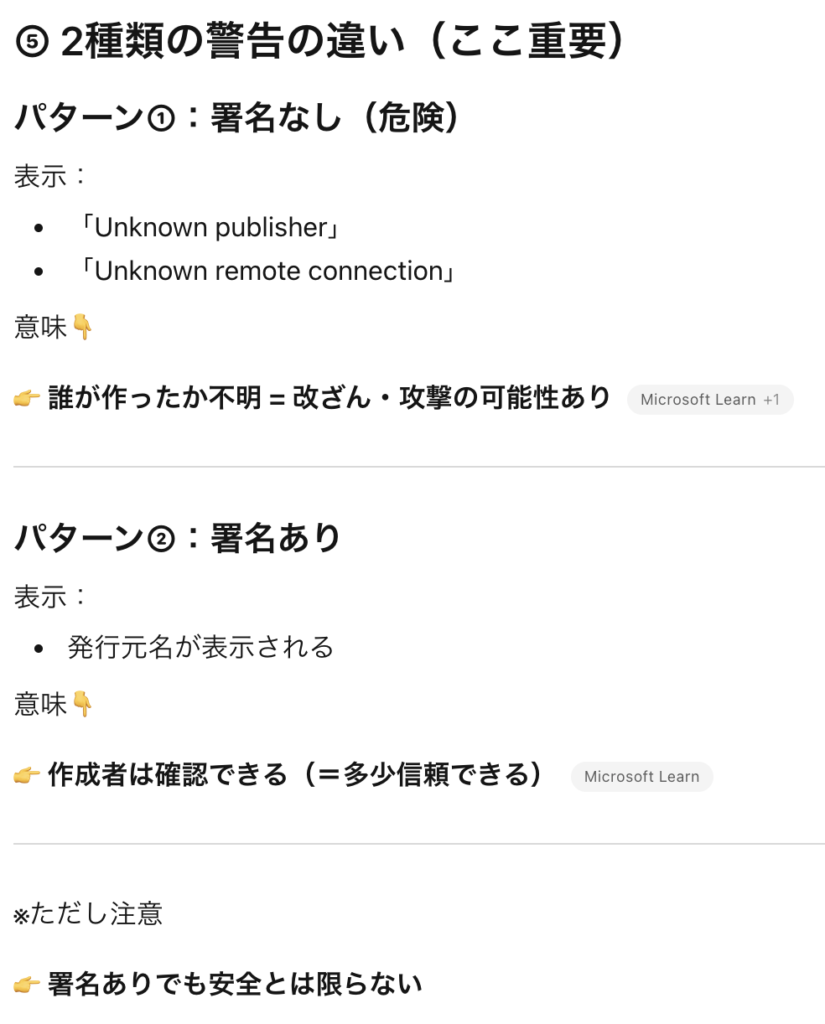 この仕組みはフィッシング攻撃への対策として重要です。攻撃者が改ざんしたRDPファイルを配布し、ユーザーを偽のサーバーに接続させて認証情報を盗むといったリスクがあるため、WindowsはRDPファイルの実行時に慎重な確認を行います。