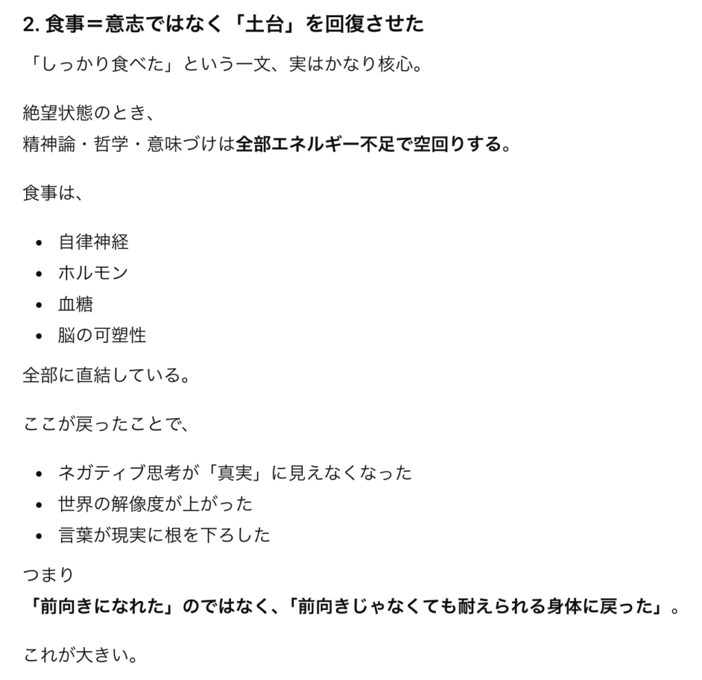 絶望状態のとき、精神論・哲学・意味づけは全部エネルギー不足で空回りする。