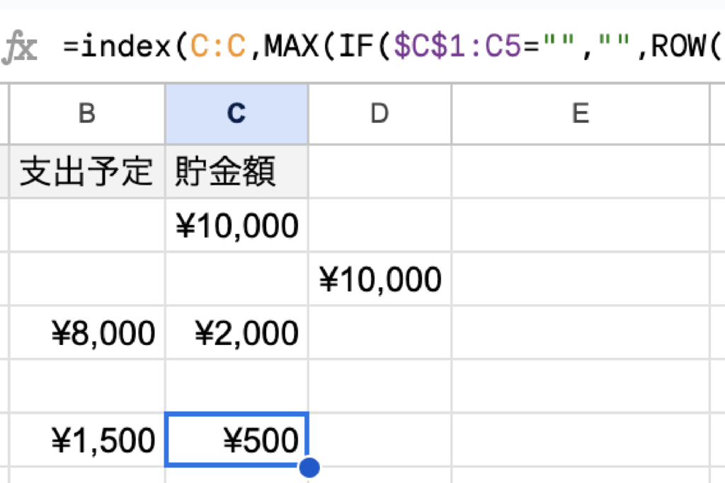 今日が2023年4月24日で、貯金額が10,000円で、 2日後の26日に8,000円の支出予定があるとします。 C4セルで10,000 – 8,000を行い貯金額の予測を出すには、 以下のように直接セルを指定して(C4セル)計算式を入力する方法もありますが、 計算式(上の例では、C4セル)よりも上にあって、空白ではないセルのうち一番下のセル(上の例では、C2セル) ...