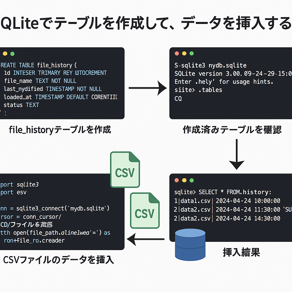 以下のブログ記事を読んでいて、SQLiteでfile_historyテーブルを作成する方法を忘れてしまっていたことに気づいた。 記録する情報の設計 SQLiteコマンドラインを使って、file_historyテーブルを作成する ターミナルでSQLiteを起動して、CREATE文を入力する。 .tablesで作成したテーブルを確認できる。 今自分がいるpythonディレクトリにm ...