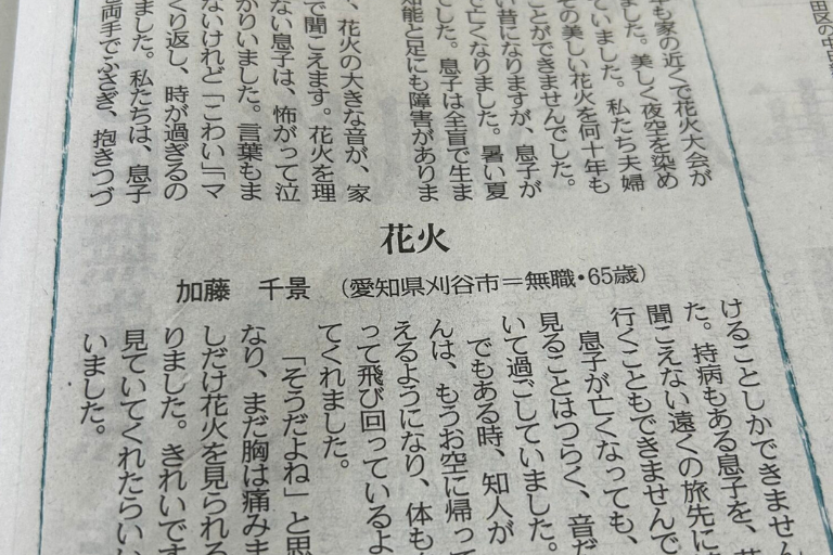 祖母の家にあった新聞に心を動かされた。 いのちのストーリー 自分と同じ愛知県刈谷市に住んでいる65歳の女性の息子の話。 毎年の花火大会で、6歳で亡くなった息子が花火の大きな音を怖がっていた。 この女性は、花火を見ることができなかったそうだ。 しかし、知人が「息子さんは、もう目が見えるようになって、空に帰っている」ということを言ってくれて、65歳の女性は、まだ胸は痛むが、綺麗な花 ...