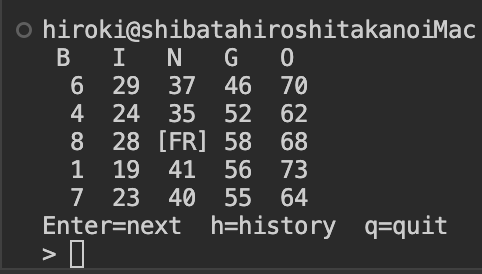 header = "".join(f"{ch:^{CELL_W}}" for ch in "BINGO")