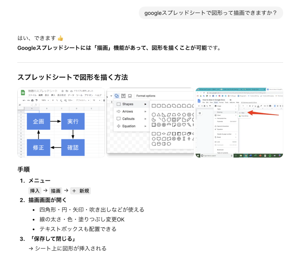 「googleスプレッドシートって図形って描画できますか?」という質問。