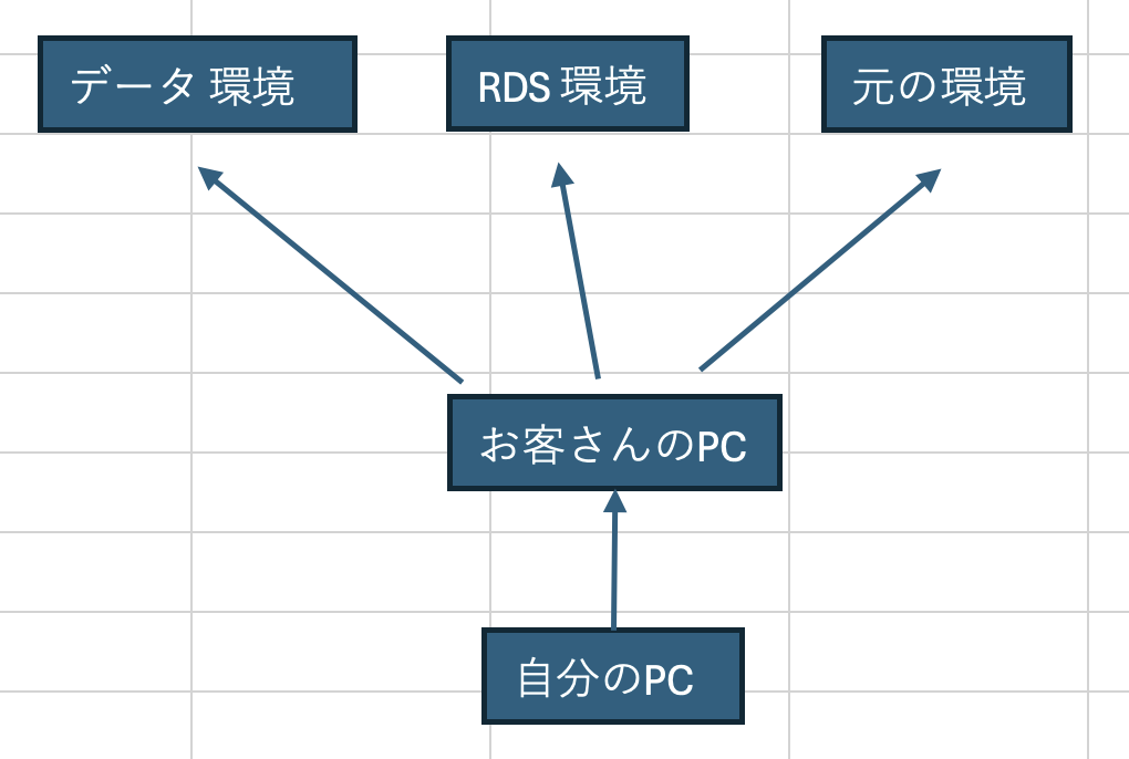 自分のPCからお客さんのPCに接続 → データ環境、RDS環境、元の環境に接続