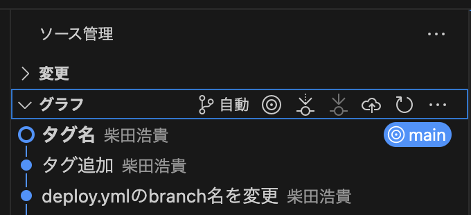 ローカルとリモートの状態はこちら。タグ追加というコミットから分岐している。