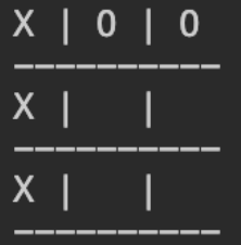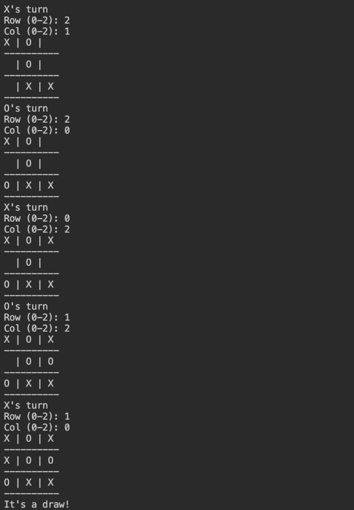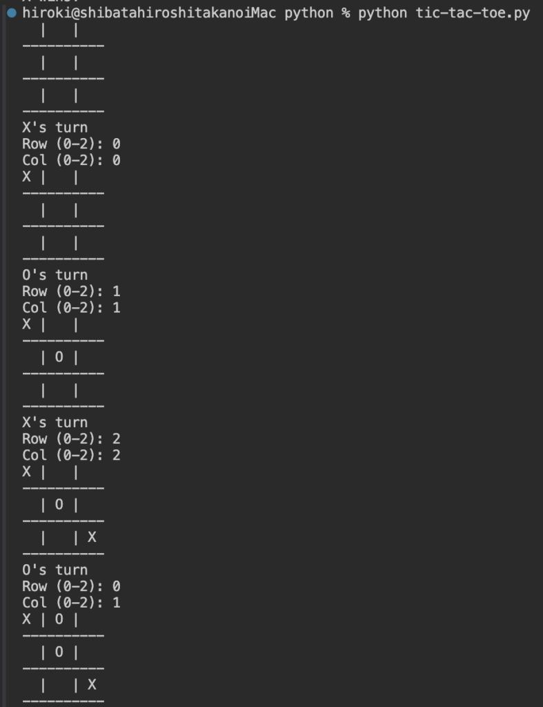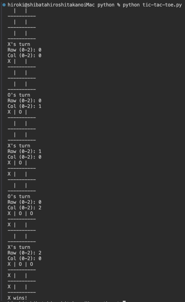実行すると空の盤面が表示され、プレイヤーXのターンが始まります。行と列の数字を入力して、(0, 0)の位置にXが入力されました。プレイヤーOにターンが変わります。X→O→X→O→Xとゲームが進んでいき、0行目がすべて揃ったので、Xの勝ちです。