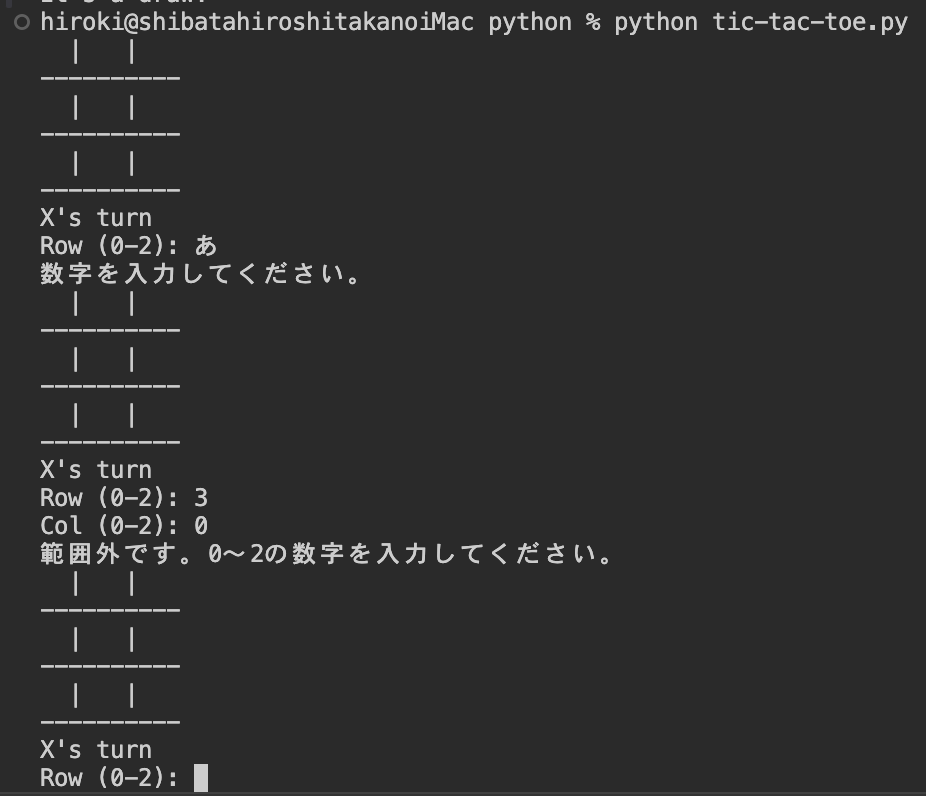 数字以外が入力されたら、「数字を入力してください。」と表示されます。0 ~ 2の範囲外の数字が入力されたら、「範囲外です。0 ~ 2の数字を入力してください」と表示されます。
